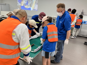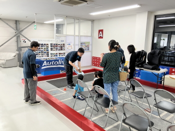当社は 2025 年 8 月、中部事業所にて、愛知県知多市と連携した「親子工場見学会」を初めて開催しました。この取り組みは、知多市が毎年夏休みに市内の小学生を対象に実施している事業で、協力企業として参加しました。はじめに見学会では、会社紹介に続き、工場内のオートメーションシステム設備、ラックフォークリフト、自立走行搬送ロボットなどを見学いただきました。その後、「道場体験」では、カーテンエアバッグの組立工程の一部を実際に体験し、我々の製品がどのように命を守っているのかを学んでいただきました。 |