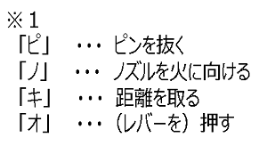 また、複数本の消火器を迷わずすぐに取りに行けるように消火器の設置場所に「近隣消火器設置マップ」を掲示しています。ならびに、朝礼・昼礼を活用した消火器使用方法(※1ピノキオ)と消火器マップの定期的なリマインドを通じ「全社員」が繰り返し訓練を行っています。 |