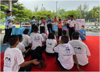 近隣の小学生を対象に開催する勉強会も恒例行事の一つで、今年は7月21日(金)に、Ban hinkhong Schoolにおいて、自動車社会の中で起こる様々な危険を回避するための勉強会を開催しました。当日は、小学生123名、先生5名、AIAP社従業員4名、ACT従業員24名、合計で156名が参加、「水没による危険防止」、「飲酒運転による危険のシミュレーション」、「どうやって安全に道を渡れるのか」、「応急処置」の四つのブースを回って勉強をしました。