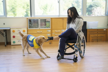 当協会の愛知県長久手市にある、介助犬総合訓練センター~シンシアの丘~では、犬の訓練はもちろんですが、介助犬との生活を希望する方(介助犬希望者)が寝泊りできる居室が設けてあり、介助犬ペアとして認定されるにあたり必要な合同訓練も行うことができます。介助犬希望者はシンシアの丘で宿泊しながら、犬の世話の仕方や犬への合図の出し方など学び、犬と人、両者の信頼度を高めていきます。