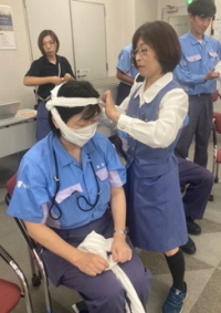講師の指導のもと、参加者が三角巾を使って止血処置を実践する様子 |