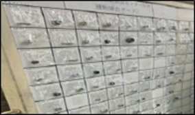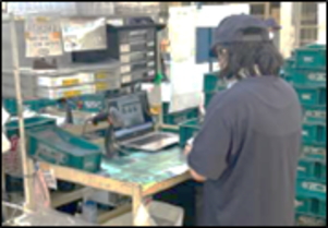 出荷品の現物照合(誤品防止目的)の際、壁に貼り付けて有る照合用サンプルから