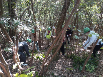 当日はなごや東山の森づくりの会の方々からご指導を頂きながら4班に分かれ雑木林の除伐を行いました。山の斜面は厳しく、伐採作業は重労働でしたが、作業前は暗かった里山が作業を通じて太陽光が地面にも届くようになり、植物の育成が見込まれる環境に整える事ができました。子供たちも普段なかなか触れることのできない豊かな自然のなかで、伐採作業を楽しみながら行いました。